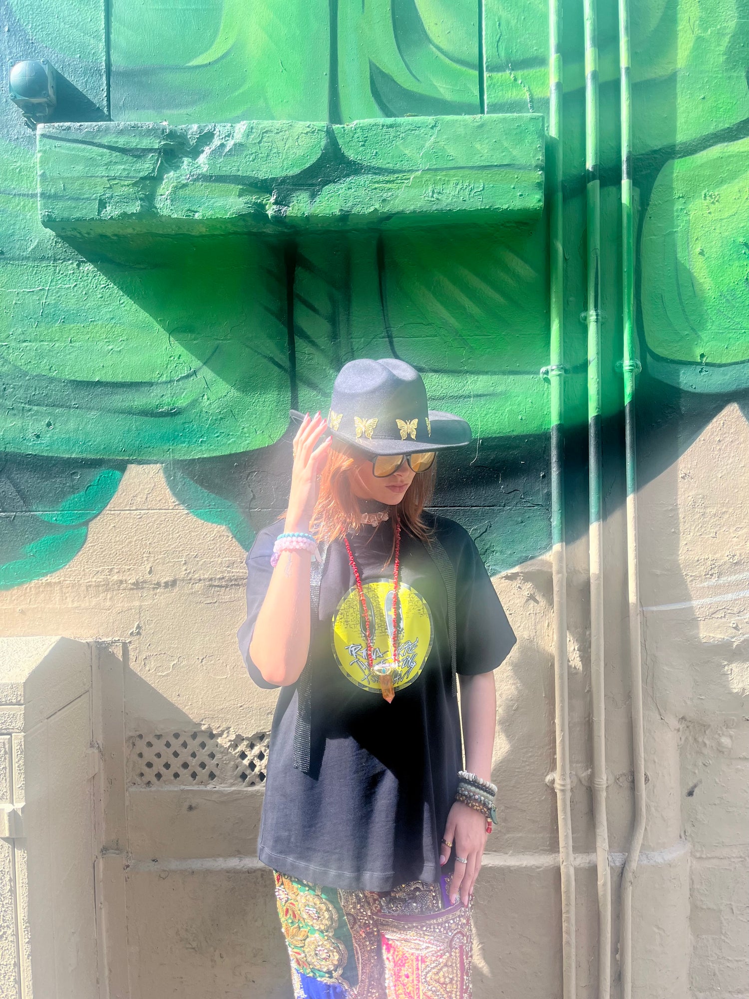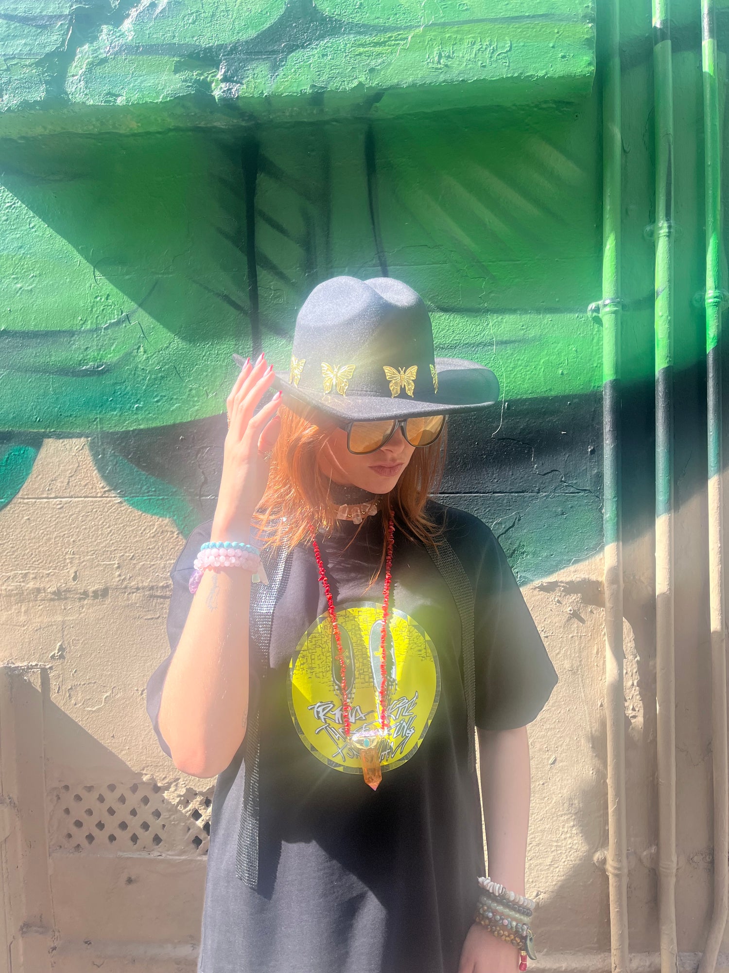 Adorned with a row of gold butterfly charms, this piece channels transformation, freedom, and light – perfect for adding a mystical statement to any look. The inner adjustable band ensures a comfortable, secure fit, whether you’re styling it for festivals, nights out, or everyday adventures.