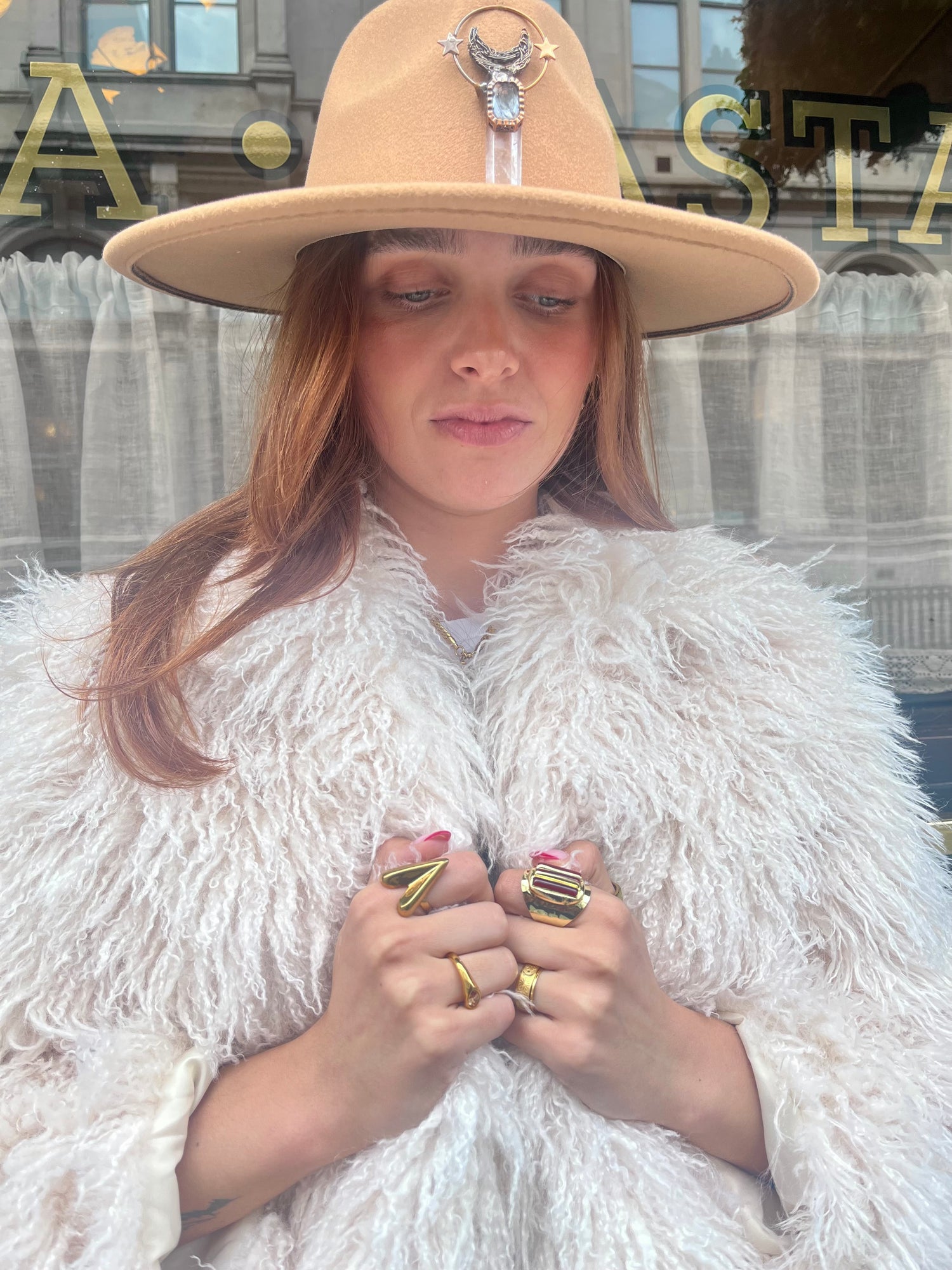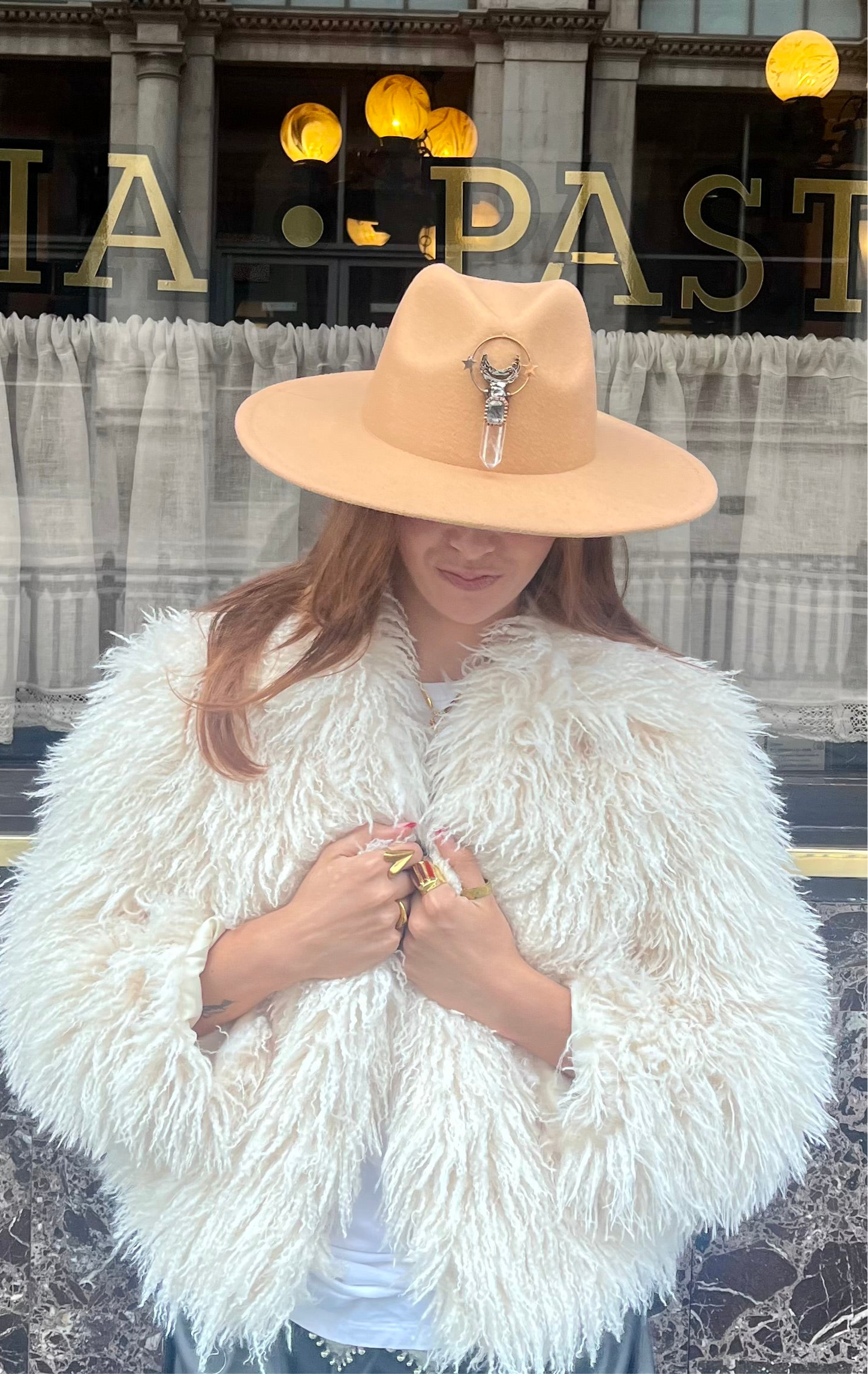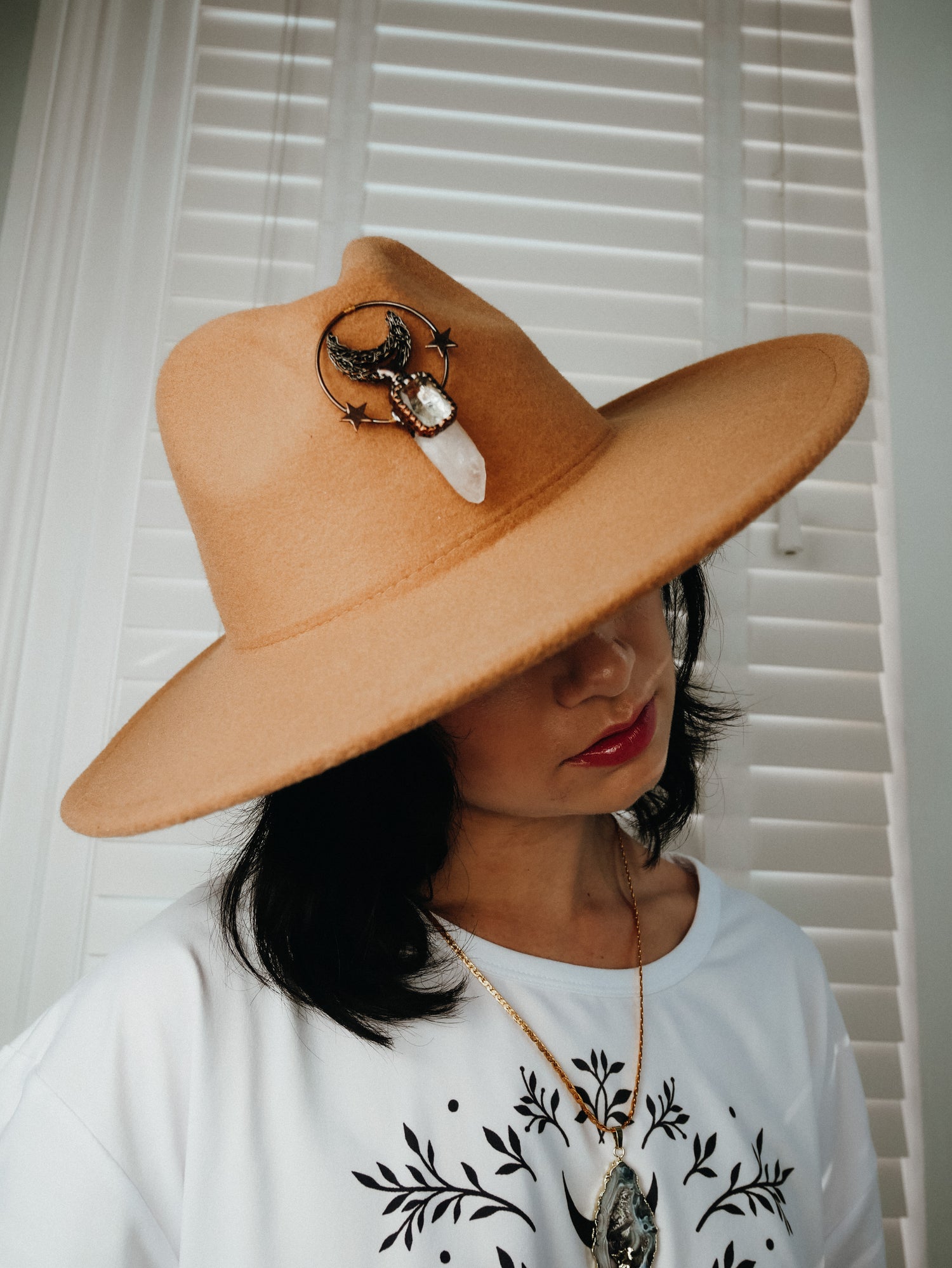 Arcana Amulet Hat – Beige Quartz Moon & Star Charm (Adjustable
