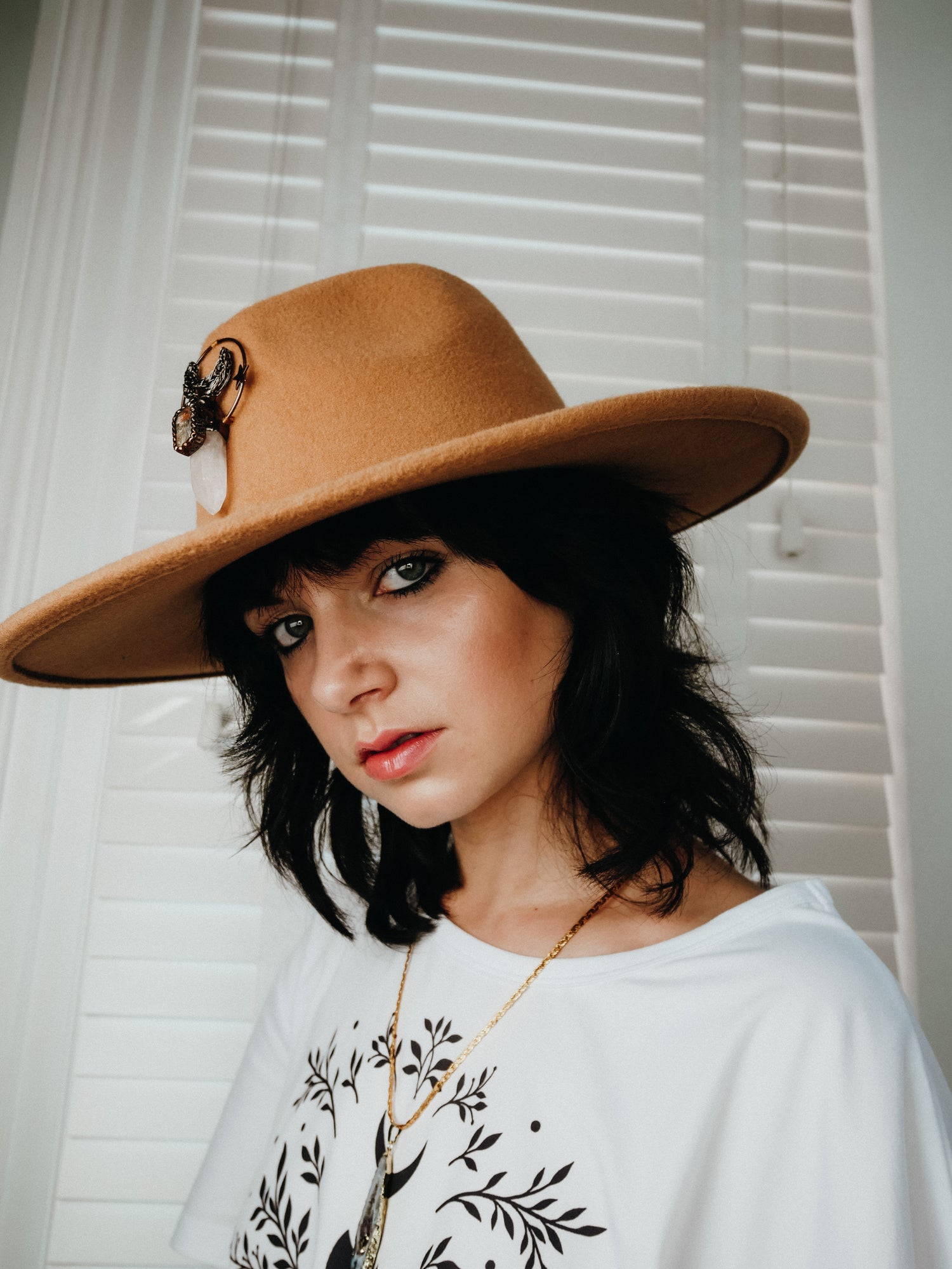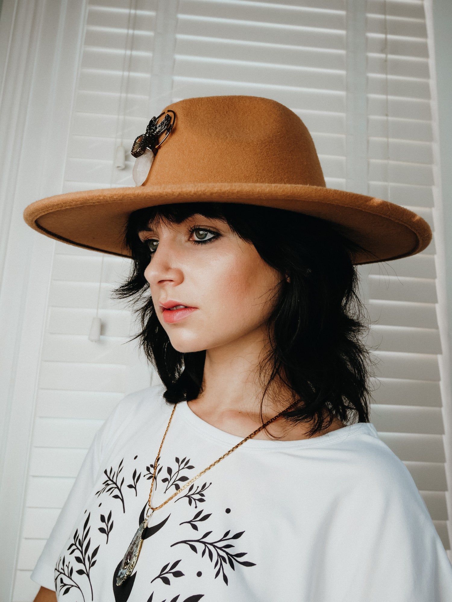The Arcana Amulet Collection embodies mystery, power, and intention. Each adjustable fedora hat is finished with a clear quartz crystal set in bronze, crowned by celestial moon and star details. Designed for festivals, rituals, and everyday magic, these hats are more than fashion — they are talismans of clarity, protection, and amplified energy.