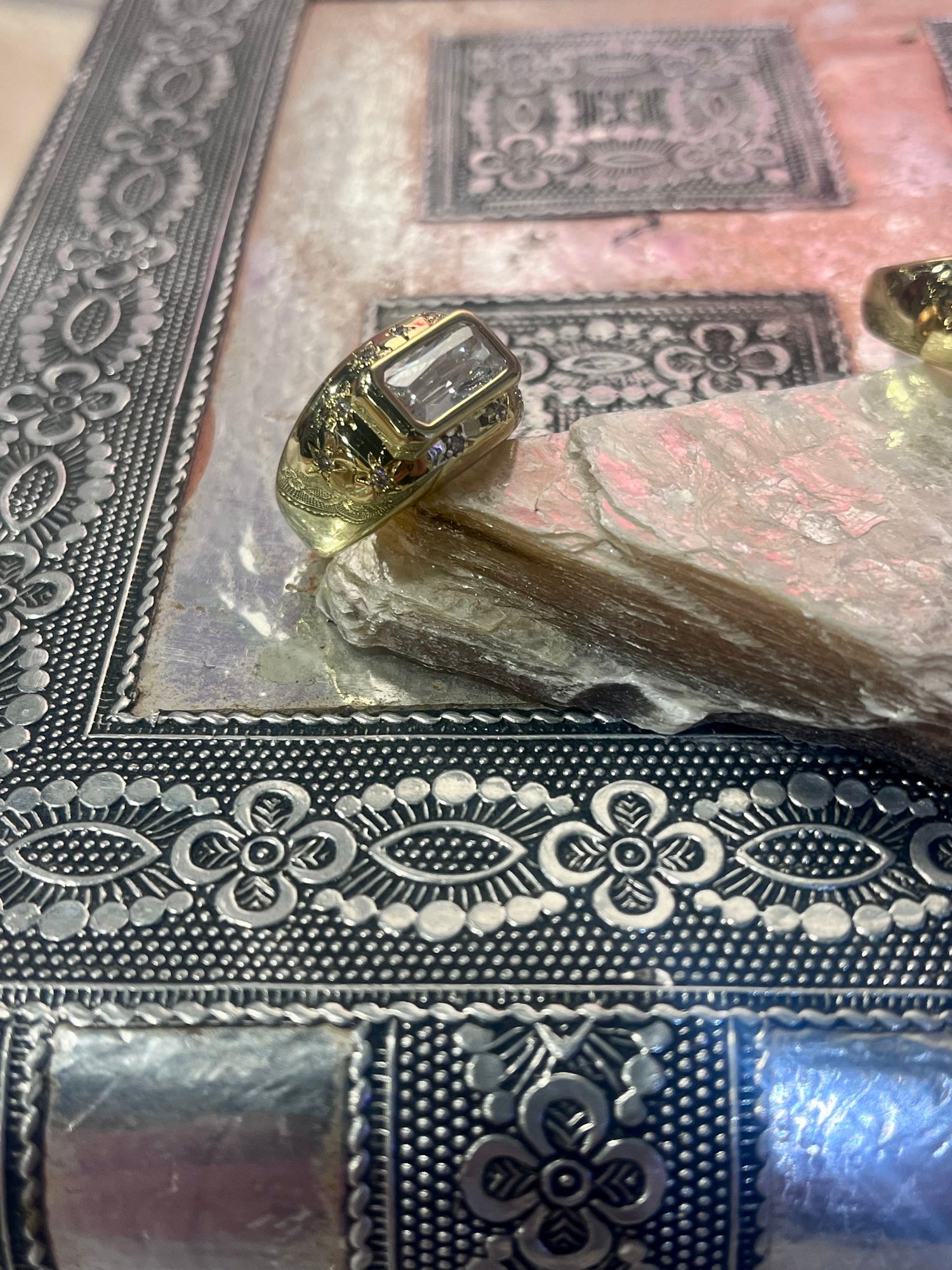 Featuring a sparkling rectangle-cut cubic zirconia crystal with delicate micro-pavé star details, this ring brings modern elegance with a celestial twist.