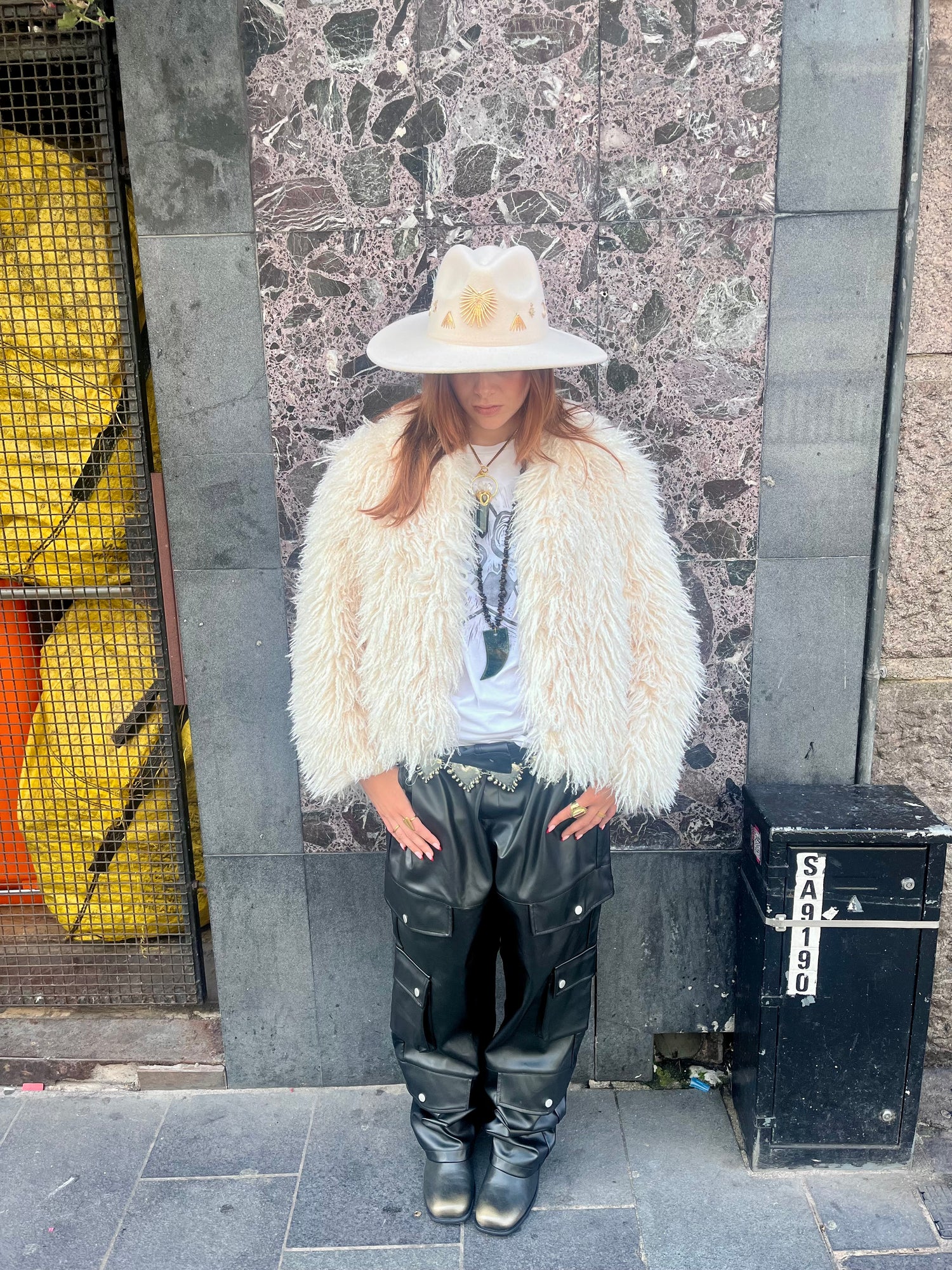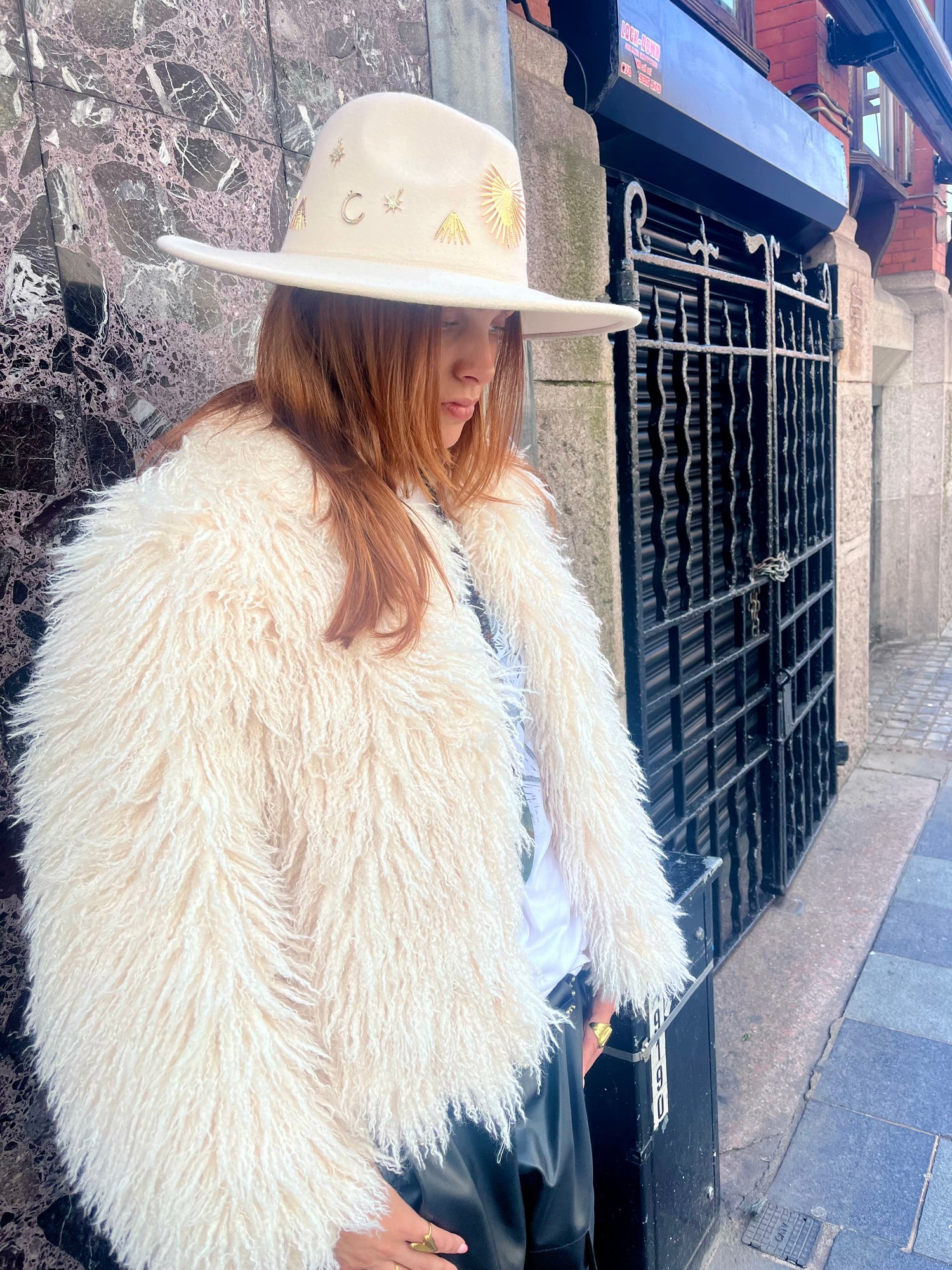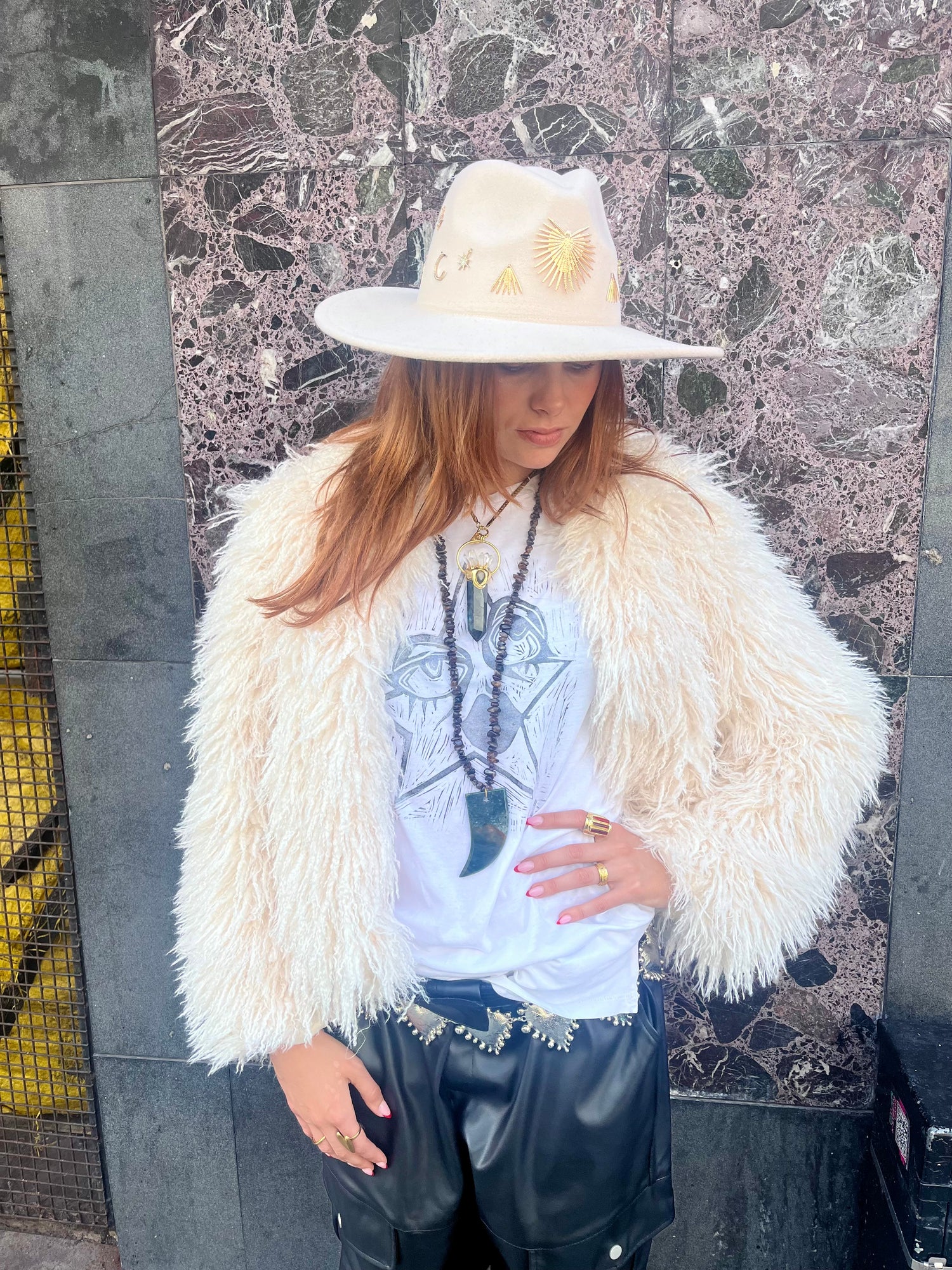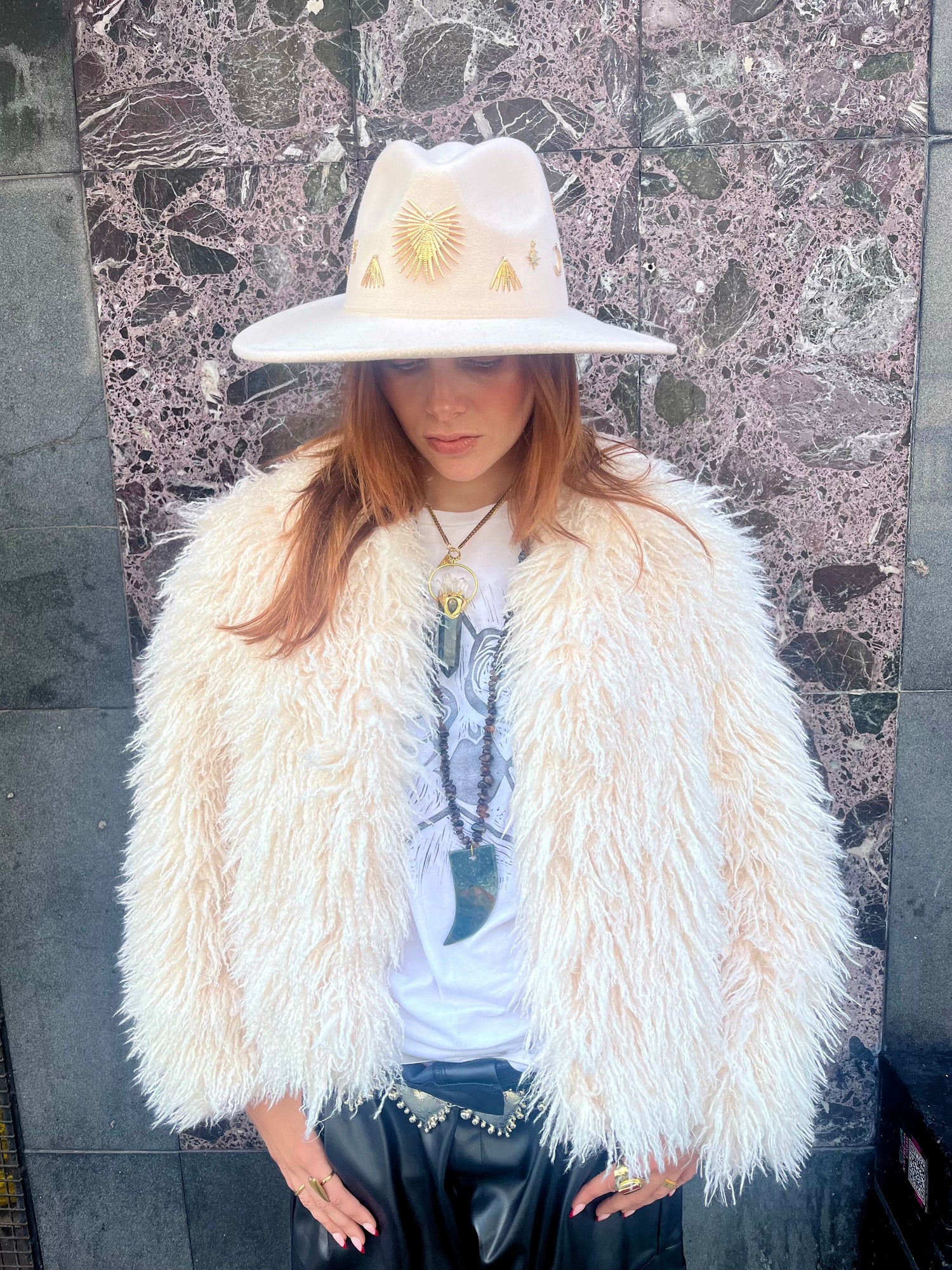 Step into the spotlight with our Cream Celestial Fedora, part of The Moon Coven’s Moon Dance Collection. Crafted in soft cream felt, this wide brim fedora is detailed with shimmering gold stainless steel celestial charms – radiant suns, crescent moons, and guiding stars – turning a timeless silhouette into a cosmic statement.