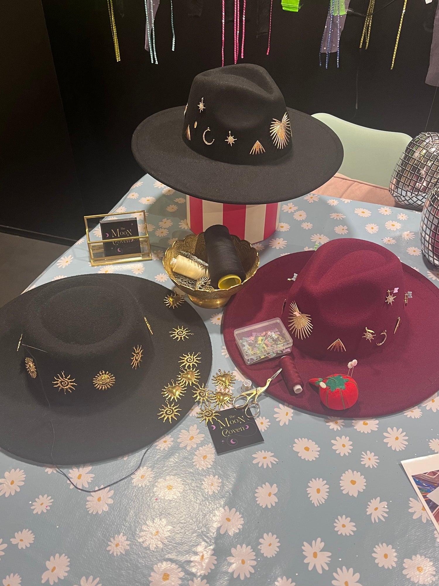 From daydreams to dancefloors, the Black Celestial Fedora from our Moon Dance Collection is a statement piece woven with cosmic energy. Crafted in deep black felt, it’s adorned with radiant gold stainless steel charms – suns, moons, and stars that shimmer with celestial power.