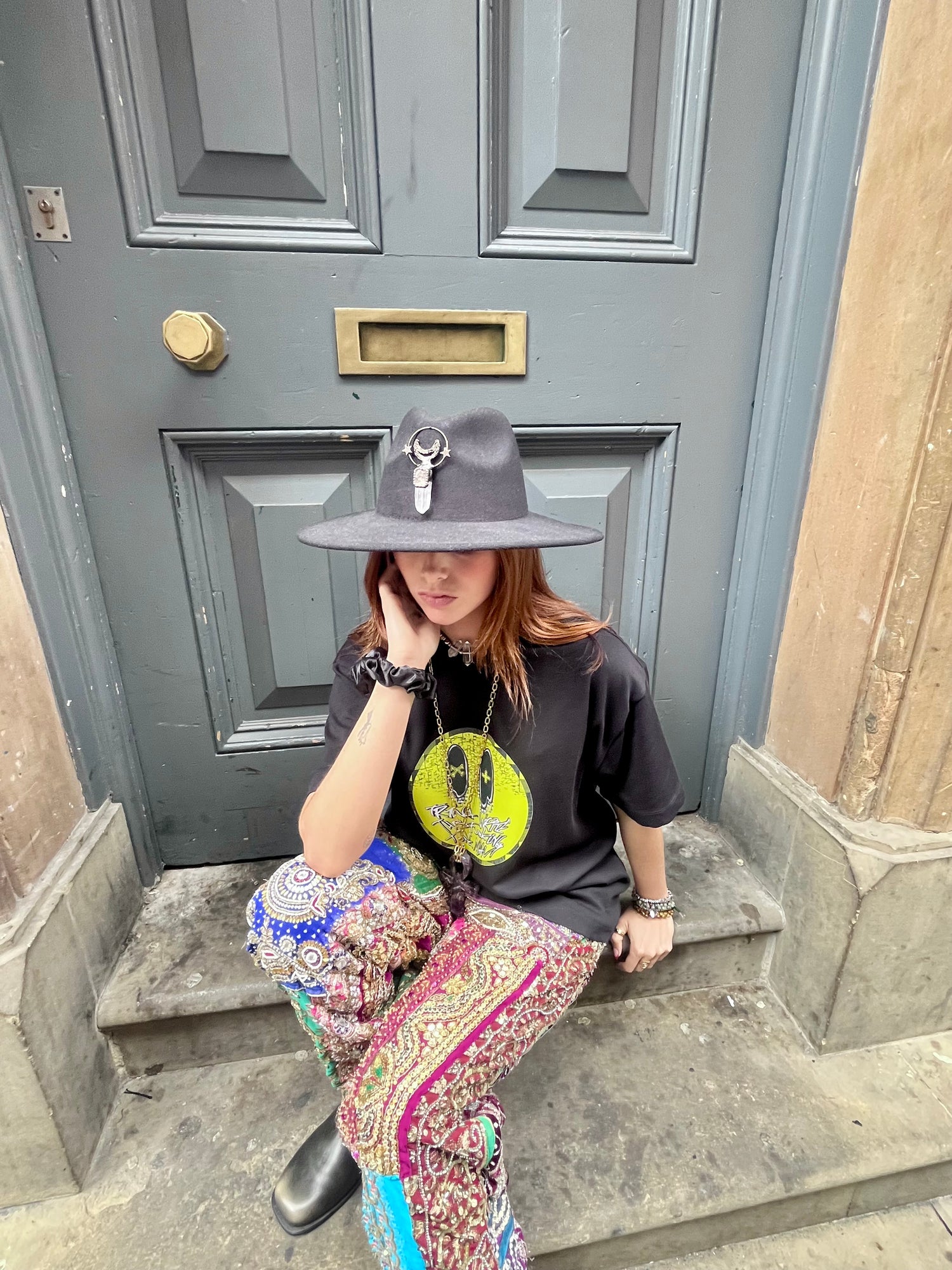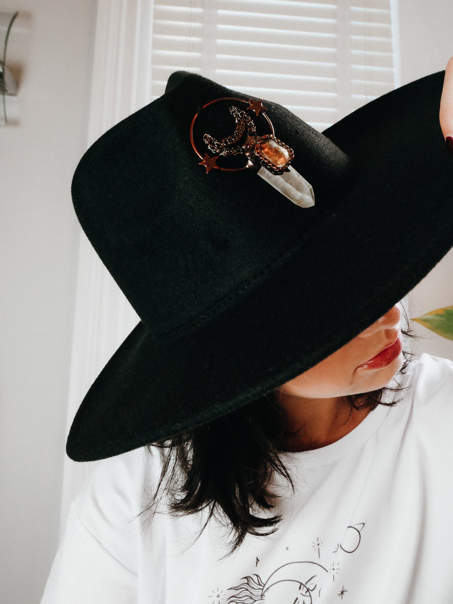 The Arcana Amulet Collection embodies mystery, power, and intention. Each adjustable fedora hat is finished with a clear quartz crystal set in bronze, crowned by celestial moon and star details. Designed for festivals, rituals, and everyday magic, these hats are more than fashion — they are talismans of clarity, protection, and amplified energy.