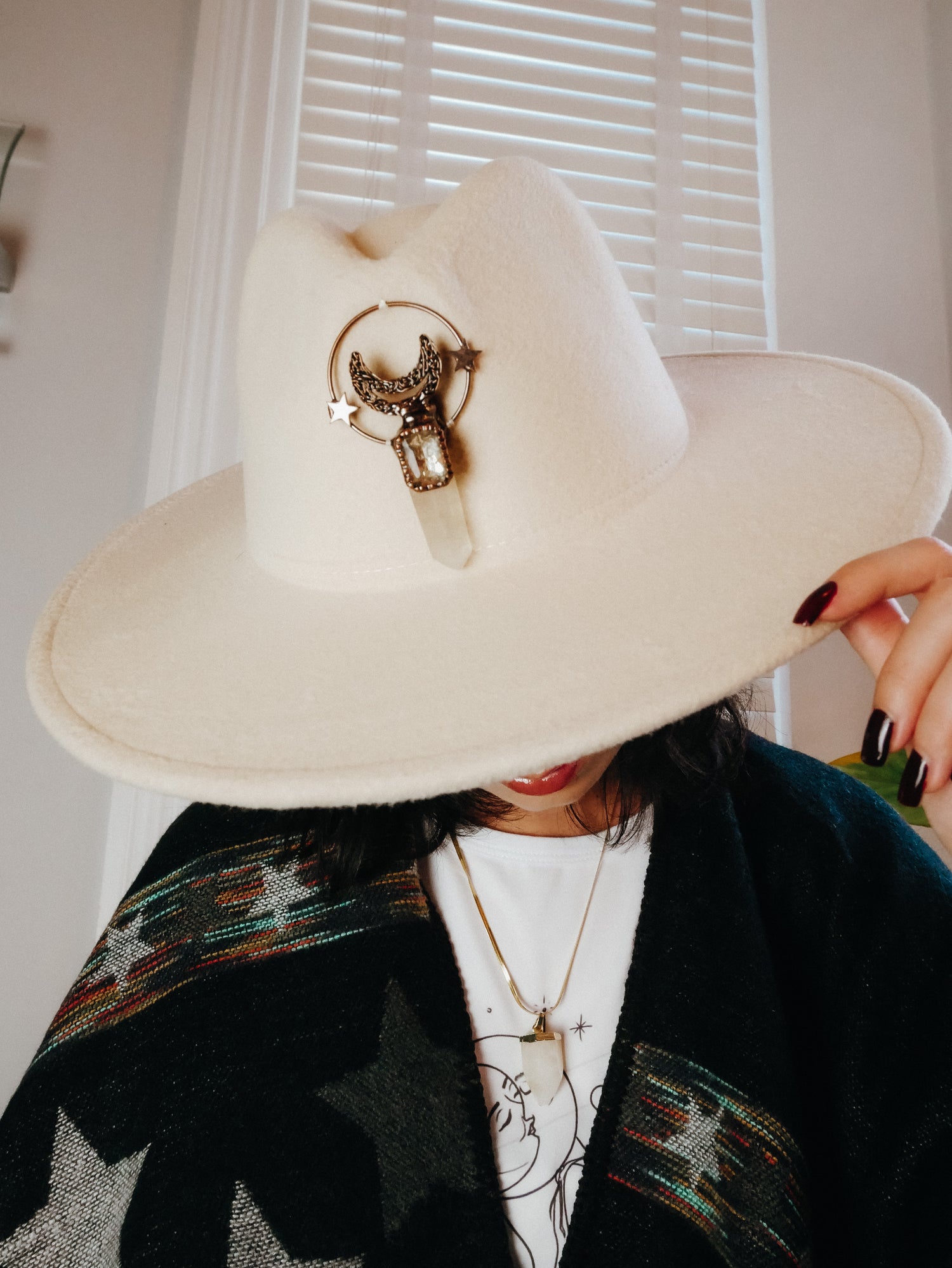 Channel purity and illumination with the Arcana Cream Hat. The clear quartz charm, set in bronze with moon and star symbols, aligns with clarity and cosmic guidance. Adjustable for the perfect fit, this wide-brim hat radiates light while grounding your energy — ideal for ceremony, city nights, or sunlit adventures.