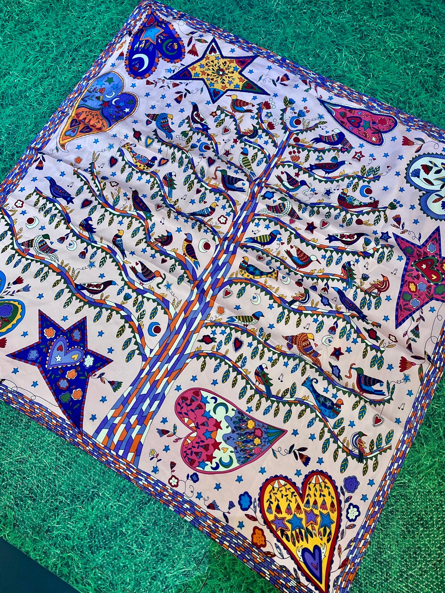 Step into a world of colour and symbolism with the Mystic Garden Satin Scarf Collection. Crafted from smooth satin-polyester, these versatile 90x90cm scarves feature intricate designs of trees, stars, hearts, and celestial motifs – a wearable artwork that carries mystical charm and bohemian spirit.