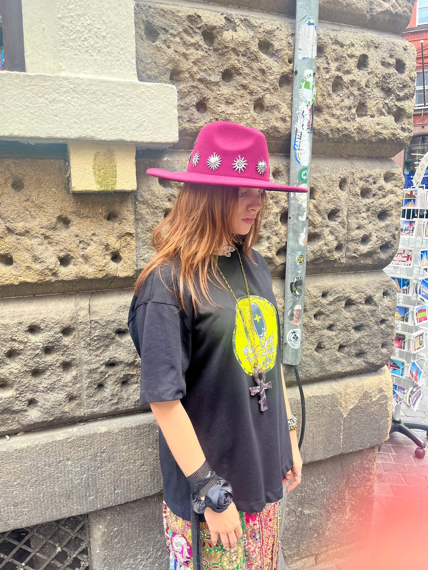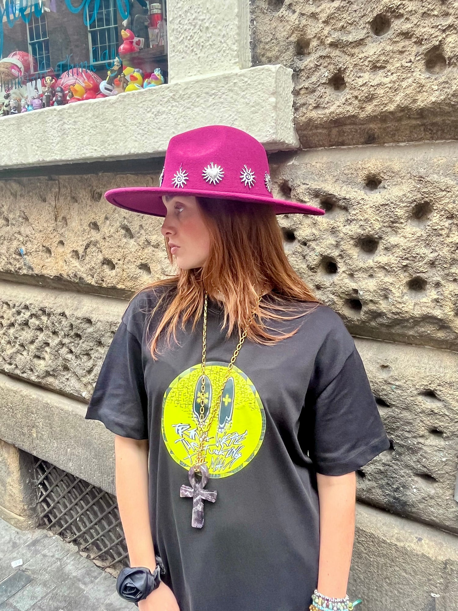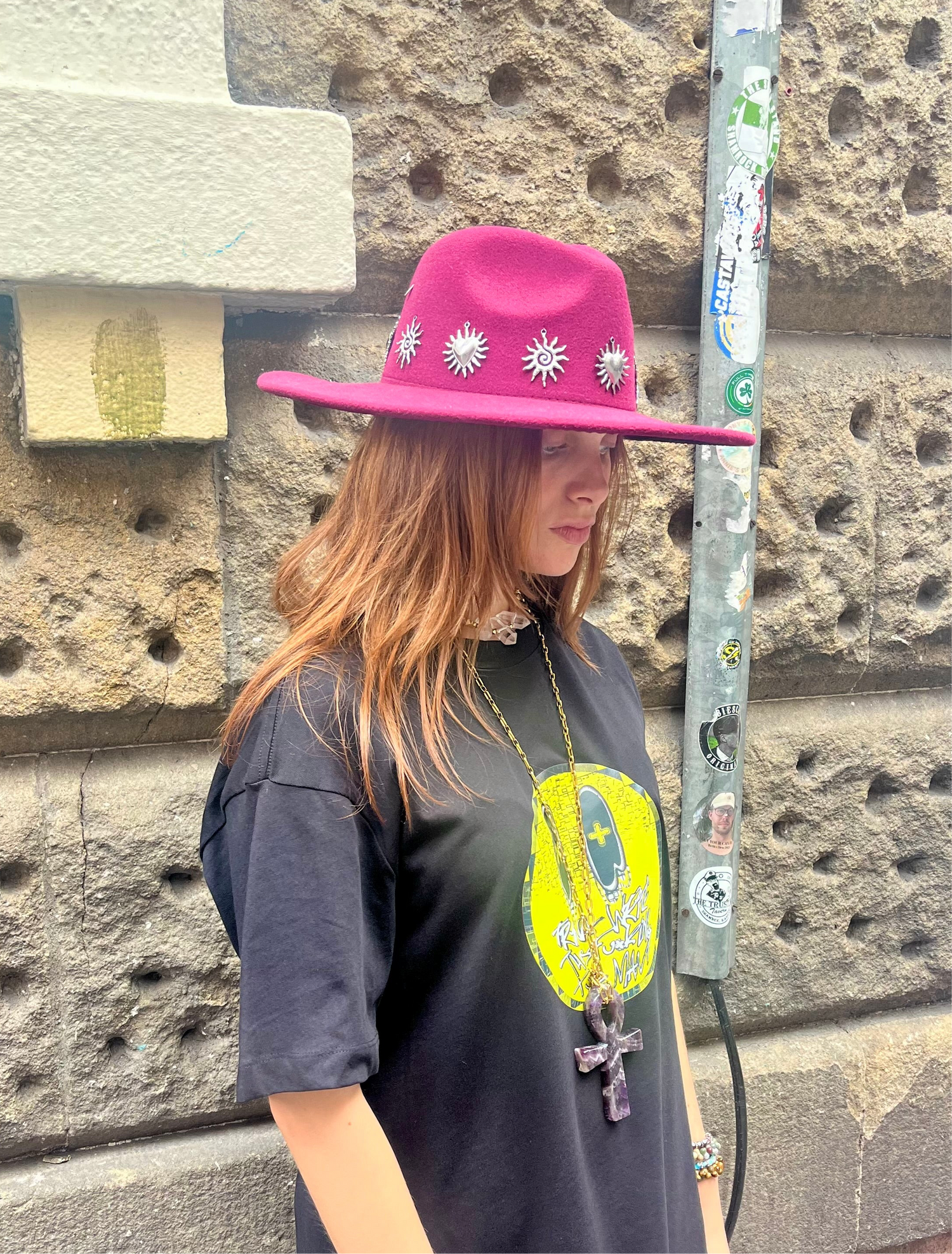 Stand out in rich burgundy with this wide-brim fedora, finished with striking silver stainless steel sun and sacred heart charms. A bold, mystical piece that blends boho edge with celestial styling.
