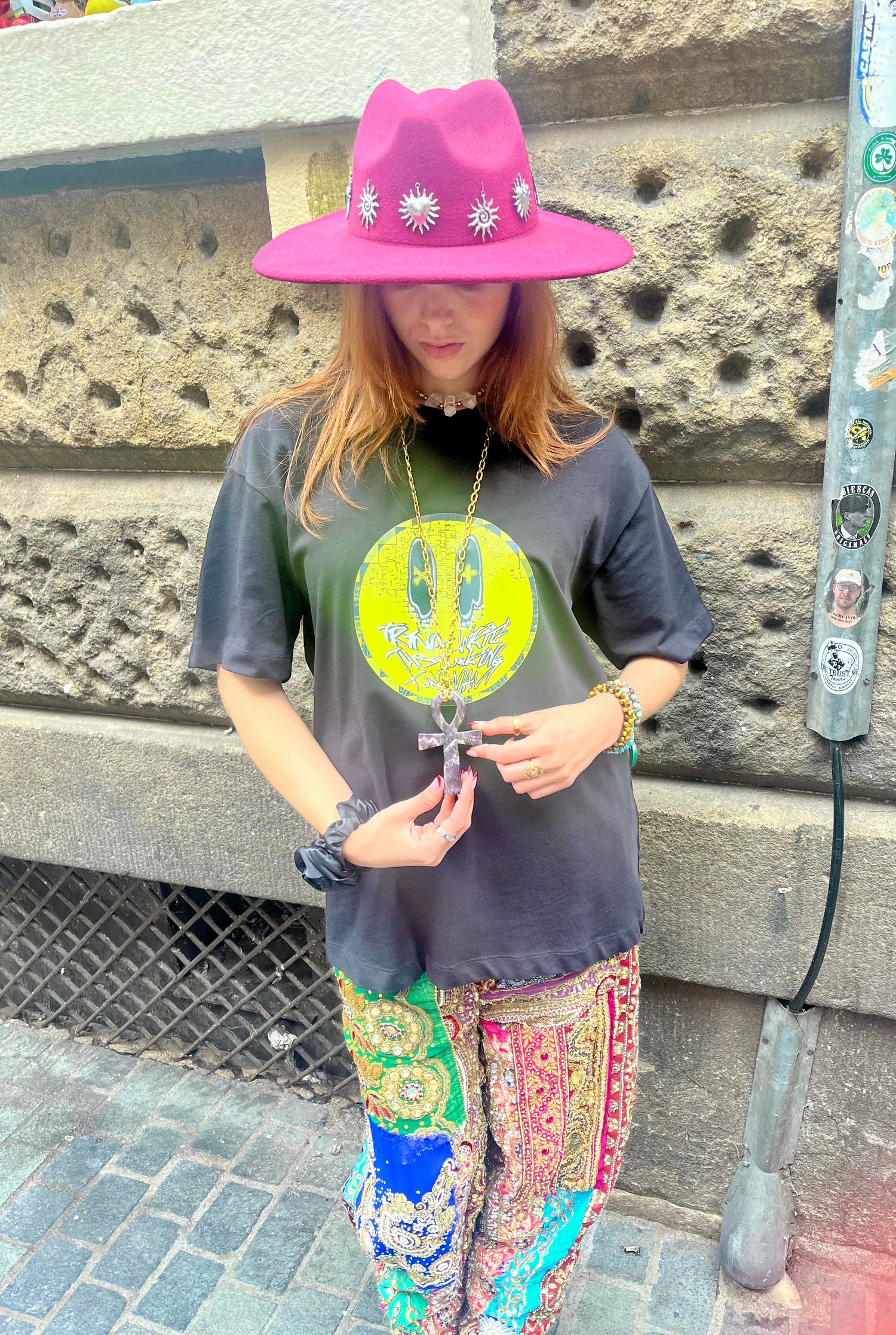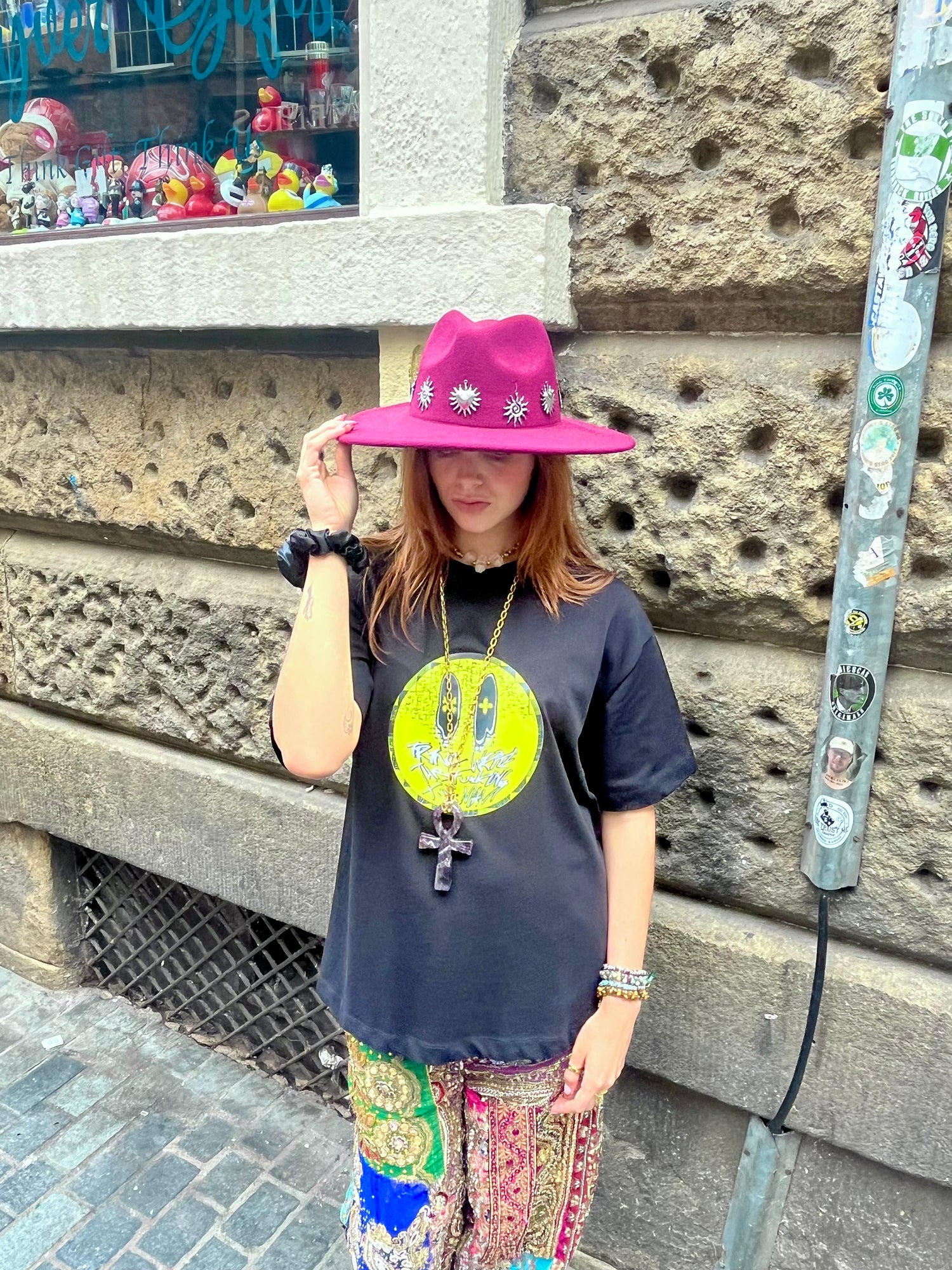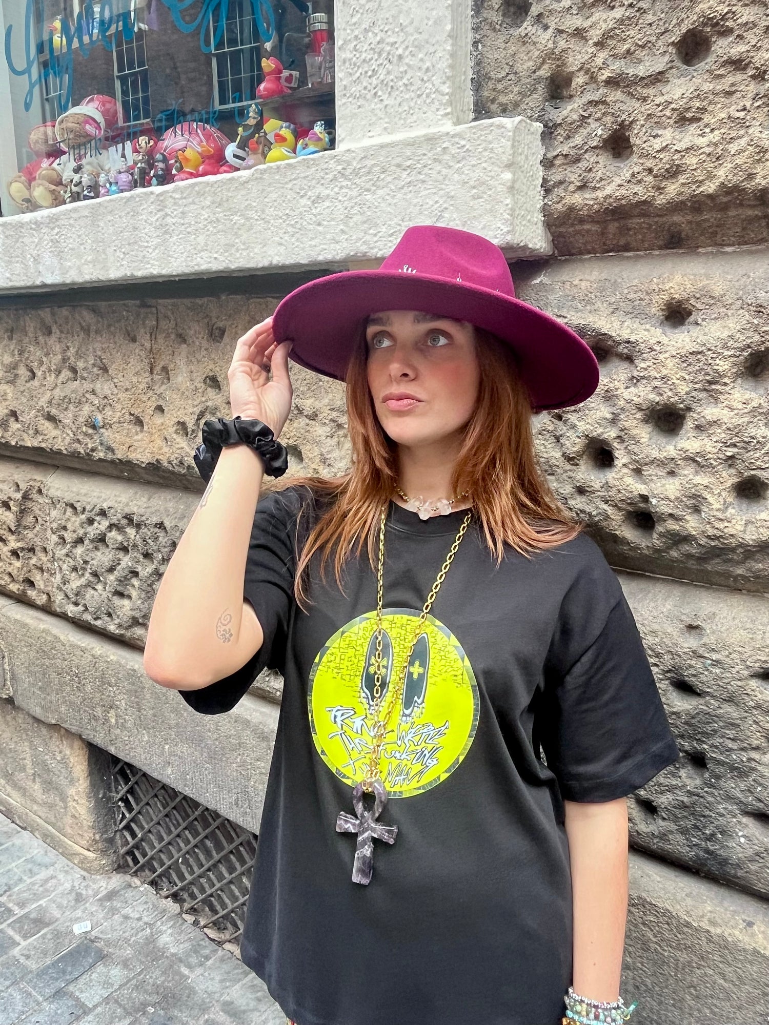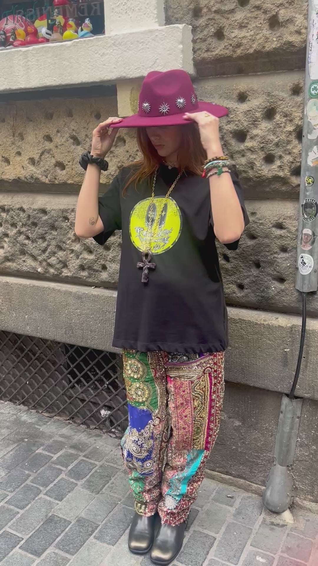 Stand out in rich burgundy with this wide-brim fedora, finished with striking silver stainless steel sun and sacred heart charms. A bold, mystical piece that blends boho edge with celestial styling.