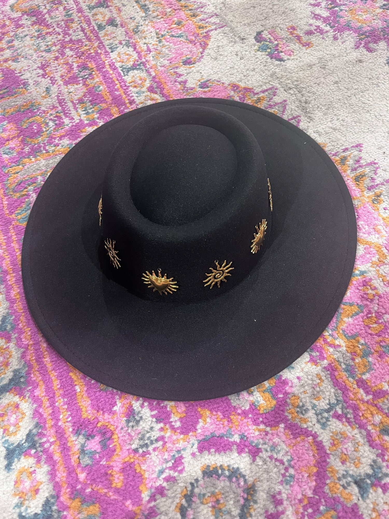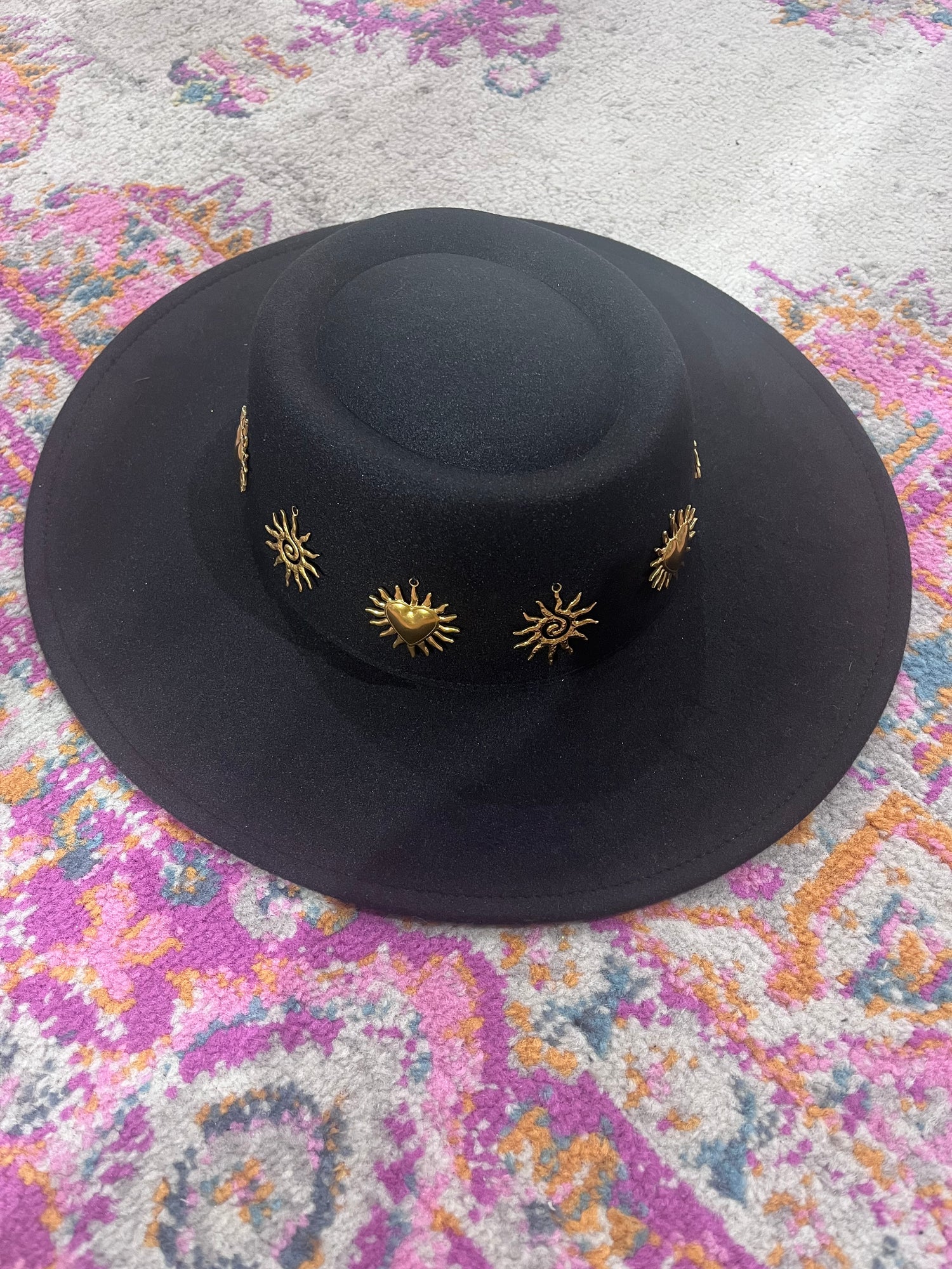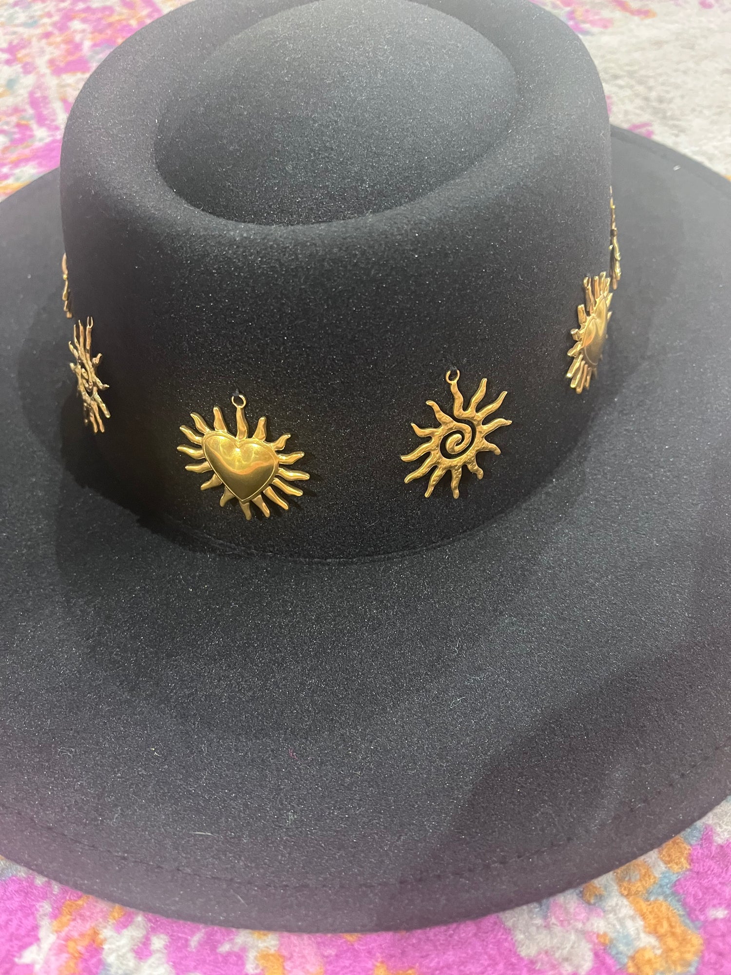Step into your power with our Black Flat Top Western Hat, adorned with gold stainless steel celestial charms – a radiant mix of suns and sacred hearts that bring a touch of cosmic energy to your look.